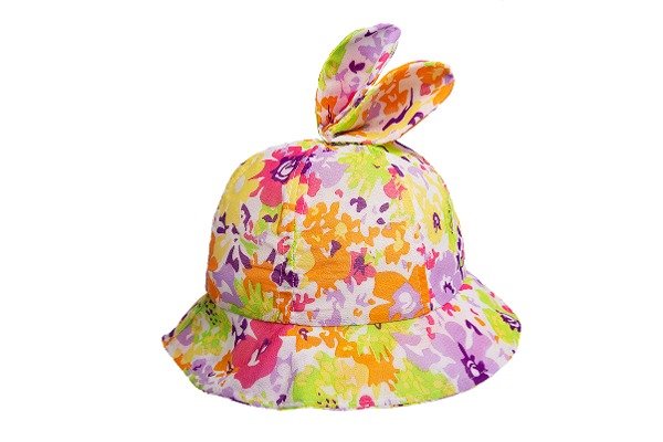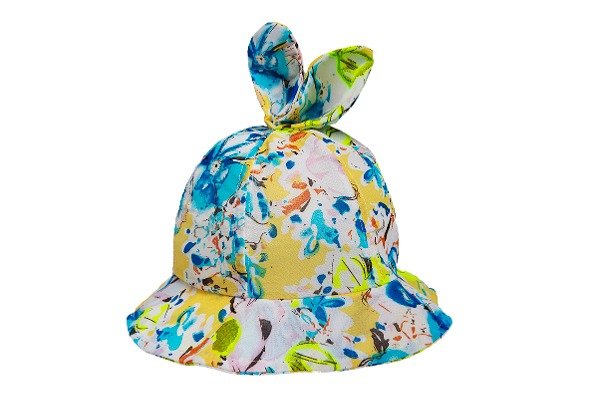 CAPOTITA DE NIÑA CON FLORES ABSTRACTAS Y OREJITAS DE CONEJO CALIDAD POLIESTER 100%. IDEAL PARA EL VERANO Y LA PLAYA COMO PROTECCION SOLAR. TALLE 50CM.